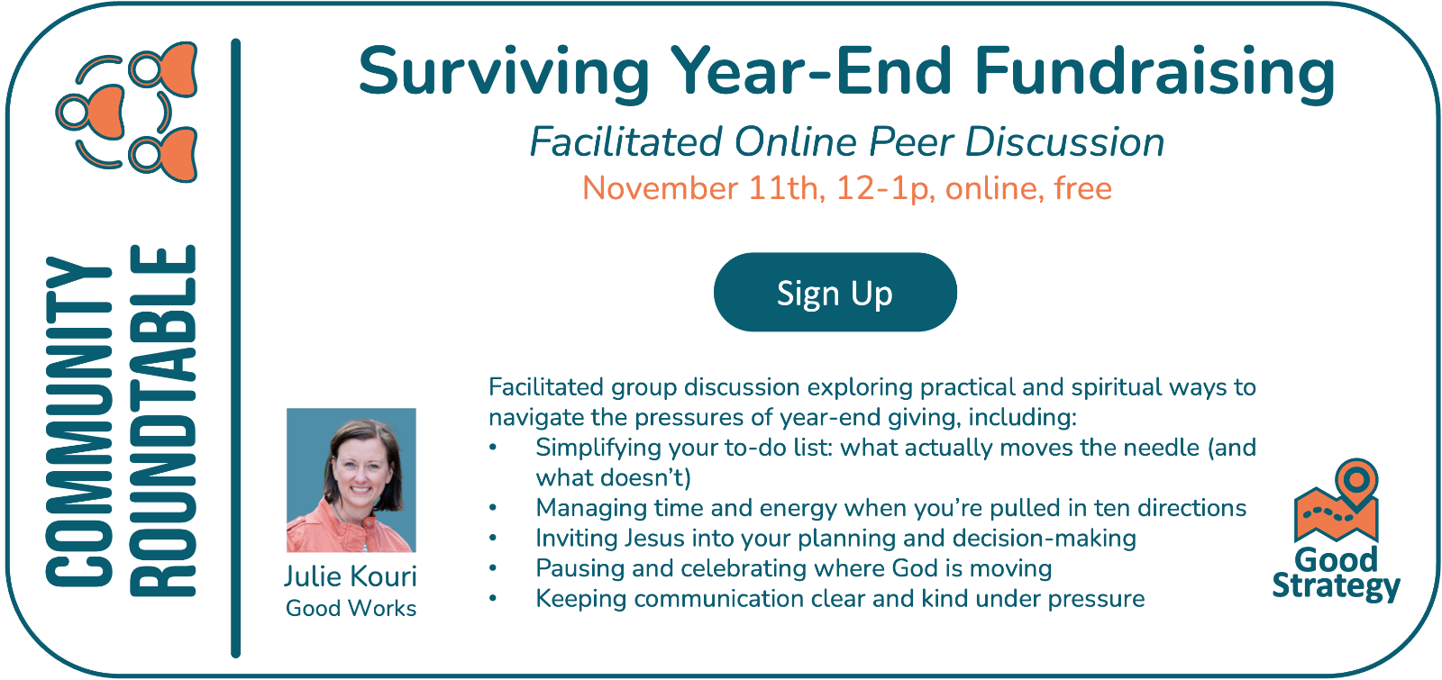 Join us for a Good Works Community Roundtable on “Surviving Year-End Fundraising.” This is not another “how-to-fundraise” session but a space to catch your breath, connect with peers, and talk honestly about what it takes to stay centered, healthy, and Christ-focused through the busiest time of year.